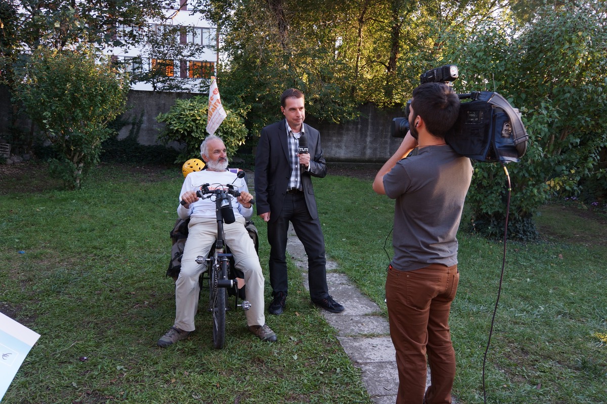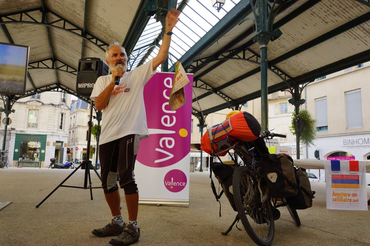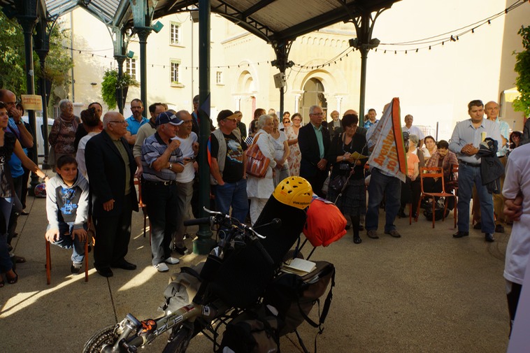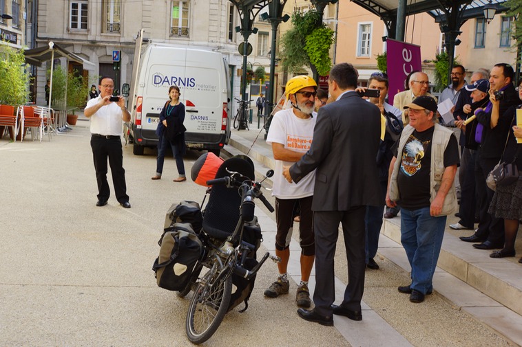 Ce sera un parcours non-stop à fond de 12h à 16h45, jusqu'à l'entrée de Valence. Un peu avant, je suis rejoint par Roger à Tain (il m'avait aussi accompagné au départ) que j'ai failli rater car j'ai abandonné l'itinéraire officiel de la ViaRhona pendant 1 ou 2 kms… Mais avant de me rendre place St Jean, je fais un détour par le square Charles Aznavour, lieu du départ le 21 juillet. Pour vraiment boucler la boucle et pour l'histoire. Et c'est sous les applaudissements des amis, de la famille, des officiels qui sont là que je suis accueilli chaleureusement. Un énorme merci à tous ceux qui étaient présents. Une sensation étrange m'envahit. Me voilà de retour, et je n'ai pas l'impression d'être parti aussi longtemps. J'ai pédalé quelques semaines en traversant quelques pays, c'est tout. Je n'ai pas l'impression d'avoir réalisé un si grand exploit que ça, contrairement à ce que l'on me dit.