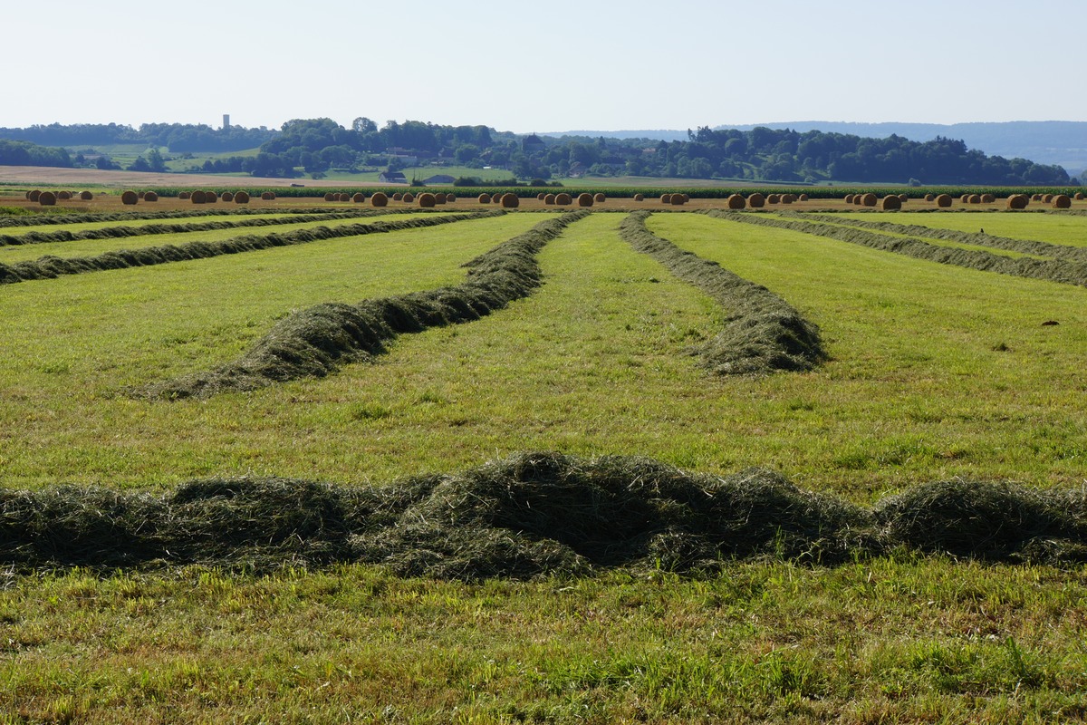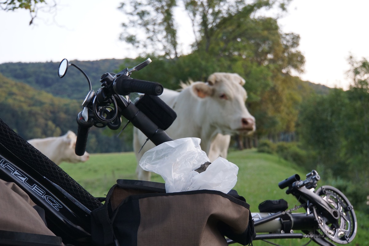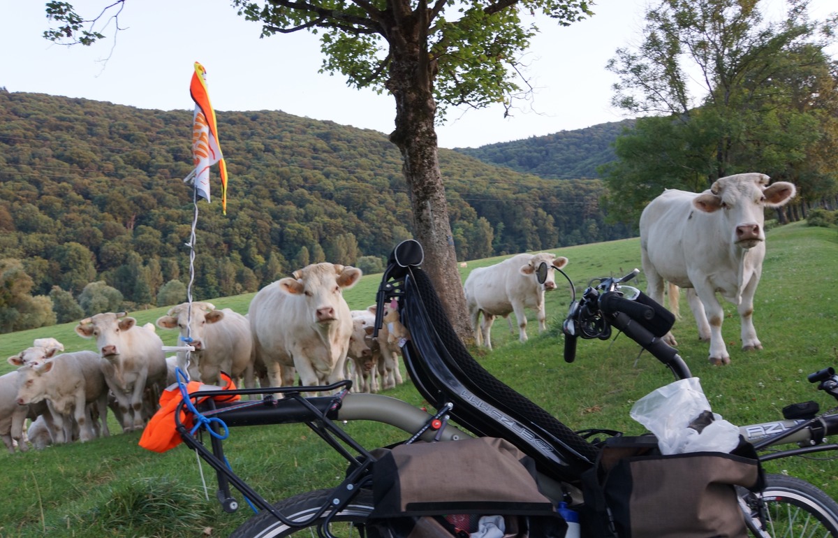 Je continue ma route pour trouver "l'hôtel" de ce soir. Après une hésitation près d'un champ de maïs, ce sera finalement à coté du canal. Je déballe mes affaires, fait chauffer de l'eau et commence à manger (riz, et fromage fondu). A ce moment, je me rends compte que le troupeau de vaches qui était au loin dans la prairie s'est rapproché. Et il avance encore. Une partie de la clôture étant inexistante, il se dirige vers moi pour arriver le long du canal. Et stoppe à deux mètres. Je me prépare à sortir ma bombe antiagression, ma pelle, mon couteau. Elles n'ont pas l'air trop méchantes, mais il y a quand même du monde… Elles s'arrêtent net et restent immobiles sur place un long moment. Intriguées par ce vélo-couchette, et menacées par Foxy, ce ne sera pas la peine d'user de la force. De toute façon je ne faisais pas le poids. Et l'épisode se termine là, heureusement pour moi. Me faire charger par un troupeau de vaches dans le Jura, ce serait quand même dommage.
