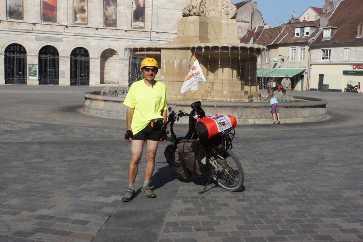 Arrivé à Arc et Senans, je m'arrête pour quelques photos. C'est un lieu splendide, anciennes salines, chargé d'histoire. Je les avais visitées lors de ma recherche d'un lieu pour le festival Sephora. En raison de mes problèmes de téléphone, je me rends à la mairie pour demander à utiliser leur ligne. La secrétaire est un peu surprise et demande l'adjoint à qui je réexplique mon histoire. Il a quand même l'air de me croire. Il m'emmène dans son bureau pour que je puisse appeler France 3 et l'Est républicain, après lui avoir montré mon vélo (et là je m'aperçois que j'avais encore laissé accroché sur le mat du drapeau avec des pinces à linge mon gant de toilette… et le reste de la lessive. Je vous laisse deviner…). Les médias sont intéressés, mais il faut rappeler…