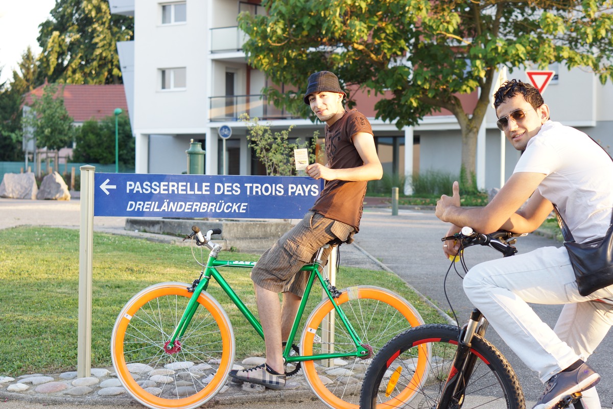 Le voyage est régulièrement entrecoupé de rencontres dès que je m'arrête. Ici avec des jeunes à Huningue et leur magnifique vélo (pignon fixe) , il montre bien ma carte….