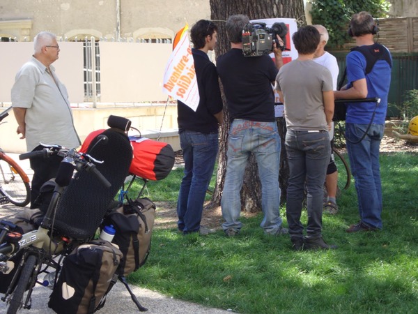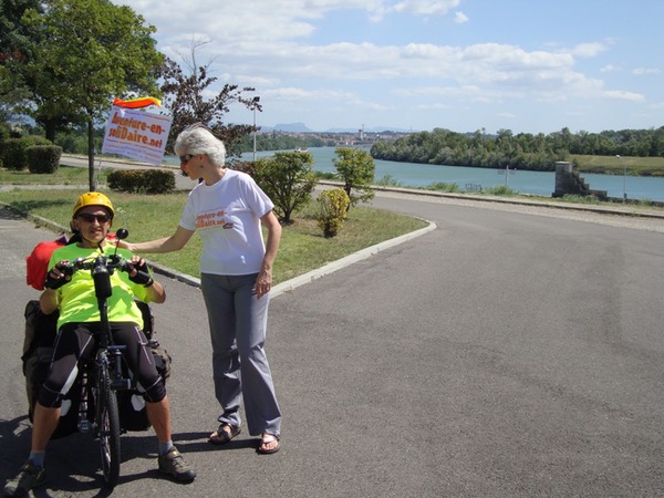 La présence de différents journalistes (France 2, RCF, Drome Hebdo, Dauphiné Libéré, Vu du Kiosque) a modifié un peu le programme, mais c'était avec plaisir. De ce fait je suis parti avec 1h30 de retard. Merci à ceux qui m'ont accompagné un bout de chemin, à vélo ou à roller, merci à Roger et Jean-Paul qui m'ont suivi jusqu'à Sarras. Super !