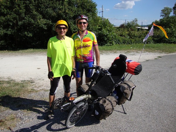 Besançon se rapproche, et je fonce. Il faut que je trouve un téléphone. Je passe devant un magasin de vélo et on me gratifie d'un grand bonjour. 300 m après je fais demi-tour et vient leur demander ce service. Bien m'en a pris. Une équipe super sympa, et on se trouve de suite des connaissances communes, surtout que Olivier, le mécano, est modérateur sur Le forum du vélo couché. Il connait Jean-Pierre Magnan, l'ingénieux constructeur de vélos en tous genres. Il me dépanne gentiment avec son téléphone, pendant que son collègue examine mon vélo pour voir s'il est bien équipé et s'il n'y a rien à me vendre… Verdict : bon pour le périple. Dommage, je n'ai pas le temps de m'arrêter. En tous cas si vous passez dans ce coin, LE RELAIS VELO c'est juste un peu avant d'arriver à Besançon sur la véloroute. N'hésitez pas à faire une halte, il fait aussi petit snack.