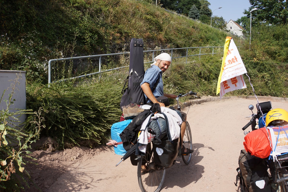 Sur la route à un moment je vois de loin un voyageur à vélo. En m'approchant, j'en doute un peu : un vélo d'un autre âge, une guitare dans son dos, un grand parapluie… pourtant il a le reste de l'équipement. Je m'arrête. C'est un hollandais qui est parti comme ça de chez lui, et il essaie de jouer tous les jours de la guitare dans la rue. On fait un petit bout de chemin ensemble. A un moment il s'arrête et me demande si je n'ai pas un peu d'huile. Ce n'était pas du luxe pour sa chaîne. Et en cherchant l'huile, je m'aperçois que le fond de ma sacoche est aussi plein d'huile… C'est la petite bouteille d'huile d'olive qui a fuit. C'est le seul petit récipient de récup que j'avais utilisé, mais voilà : il fallait aussi prendre une bouteille vraiment hermétique… Bonne leçon. Il ne faut pas trop lésiner sur l'équipement dans ce genre de voyage.