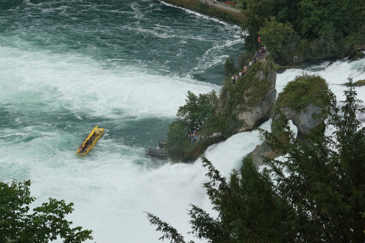 C'est toujours un peu compliqué de plier une tente mouillée, et encore plus quand il tombe encore quelques gouttes. Mais c'est ça aussi la vie en voyage. Donc départ humide. En continuant ma route, je vois de plus en plus de touristes, et je croise des cars entiers. La foule des grands jours, et je me demande pourquoi : je suis aux chutes du Rhin et je ne le savais pas… Petit arrêt pour quand même aller voir cette curiosité unique, que des gens bien intentionnés (?) avaient voulu supprimer dans le passé.
