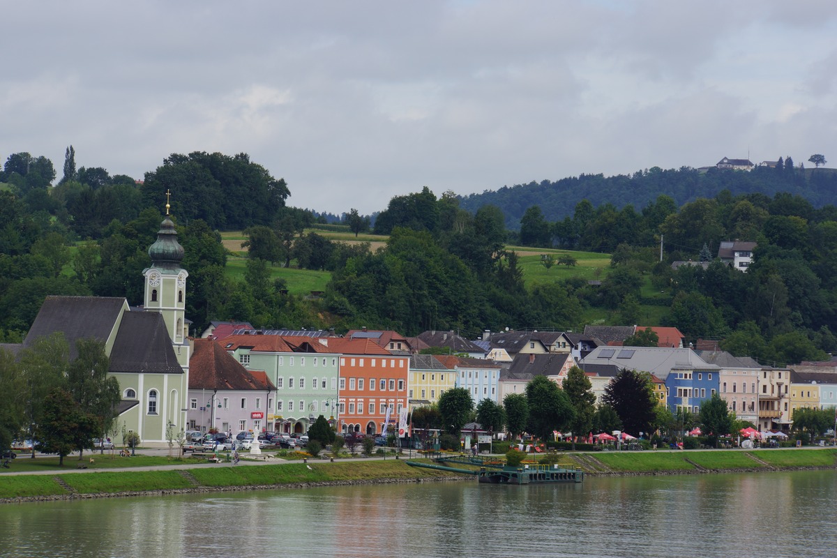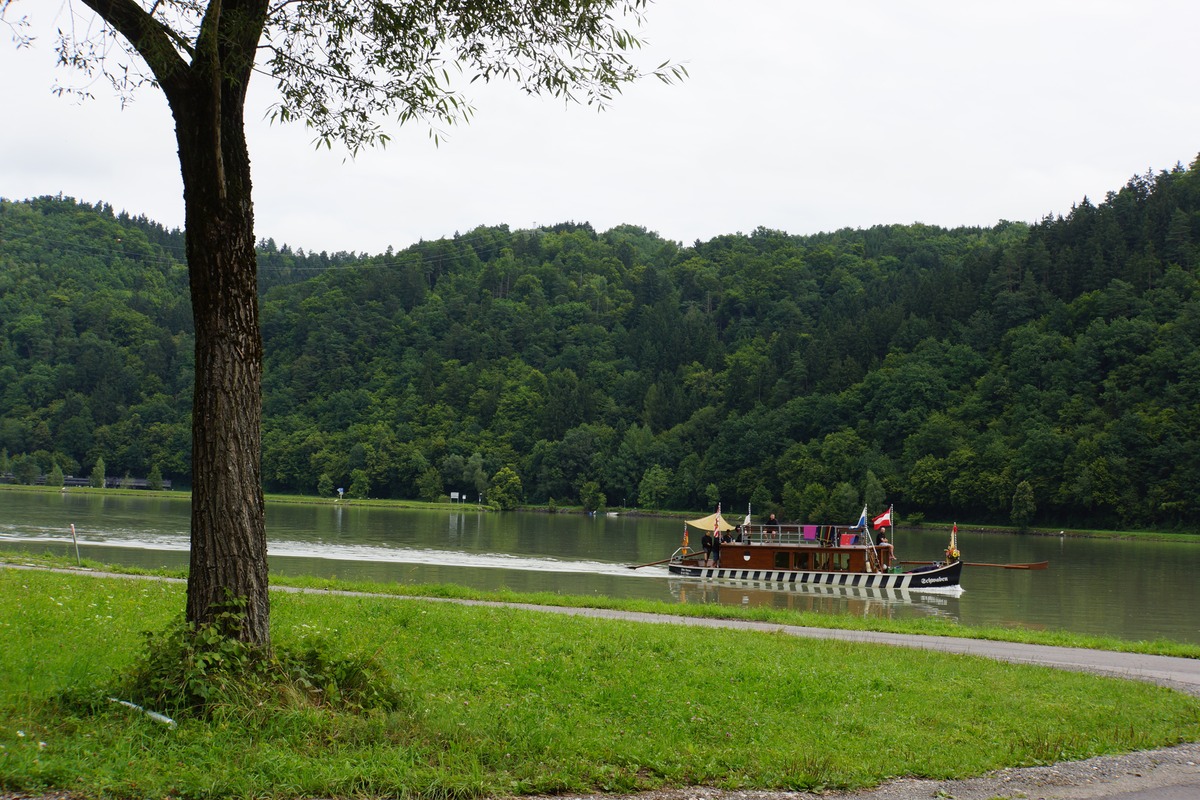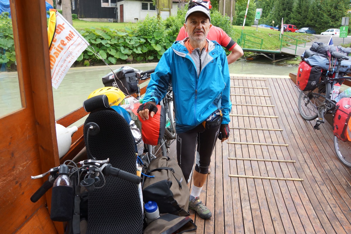 La route longe le Danube. Je crois que c'est une des plus magnifiques portions que j'ai faite le long de ce fleuve, malgré la pluie fine qui tombe. Nous longeons de magnifiques forêts, de beaux chalets, et le tout respire la paix, loin du stress et de l'agitation. Une oasis. Un peu plus loin, arrêt obligatoire. Il faut prendre un petit bateau uniquement réservé aux piétons et vélos, car la route s'arrête. Mes amis français me rejoignent dans l'attente du départ. La traversée dure 10 mn, mais c'est très plaisant.