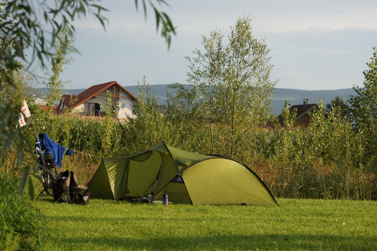 Après une nuit un peu agitée, le rangement se fait dans l'humidité. Mais je m'aperçois que j'ai oublié de poster les cartes postales d'Allemagne… Je me prépare à retourner au village proche pour les déposer, quand à cet instant des employés municipaux passent pour nettoyage du lieu. Je profite de leur demander s'ils peuvent me prendre les cartes. Pas de problème.