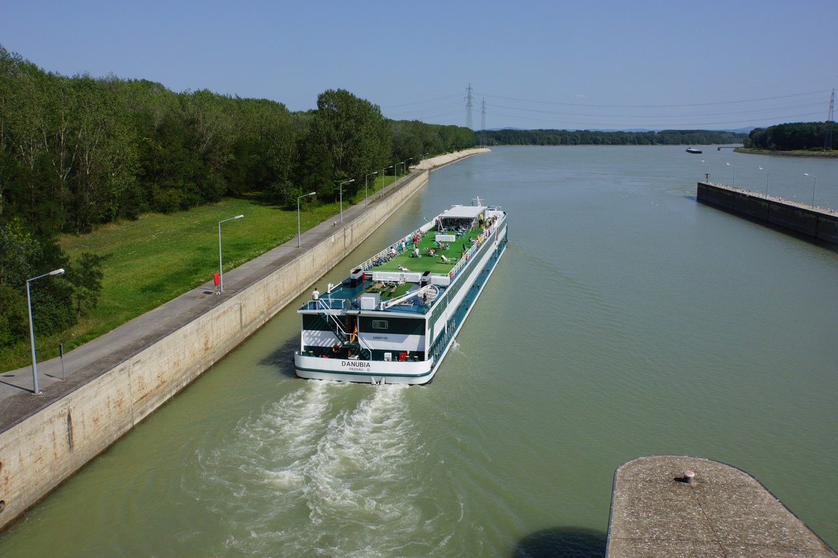 Ce grand fleuve est parsemé d'énormes écluses par moment, ou les bateaux de croisière y passent à plusieurs.