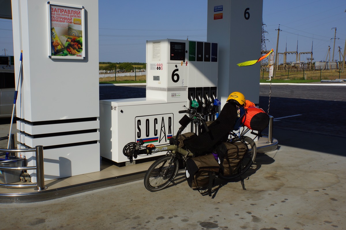 Mais la route n'est pas finie. Arrive l'heure de faire le plein. Je m'arrête dans une station et demande de l'eau. Un automobiliste arrêté comprend de suite et sort immédiat une bouteille neuve de son coffre et me la tend. Sympa. Je lui dit que j'ai besoin aussi d'eau pour me laver et je vais vers les toilettes. Il me tend aussitôt une autre bouteille d'eau non potable avec un grand sourire. Je crois que c'est le premier ukrainien que je rencontre autant attentionné et sympa.