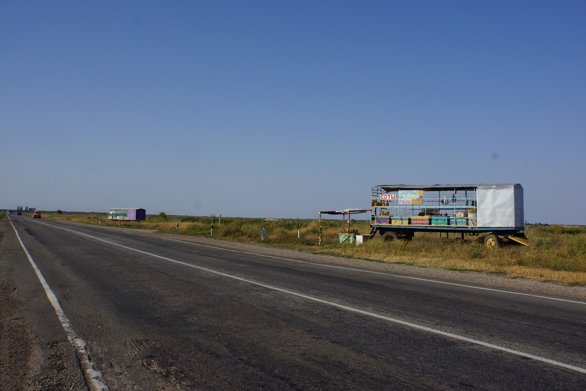 Sur cette longue route, j'avais prévu de m'arrêter manger quelques chose. Mais voilà, il n'y a plus rien à l'horizon. Vers les 16h, enfin un gros village. Je m'arrête au premier restau style routier que je vois. Carte en russe. Je ne comprends rien et personne ne parle anglais, ni français. Ca va être un peu compliqué. Finalement la cuisinière arrive avec un bol de soupe (c'est le plat populaire ici, ainsi qu'en Roumanie et Moldavie), et je lui dis ok. Ce sera donc un bol de soupe au choux, du pain, et une boisson. Pour 2 euros. Tant pis pour les pâtes ou pommes de terre.