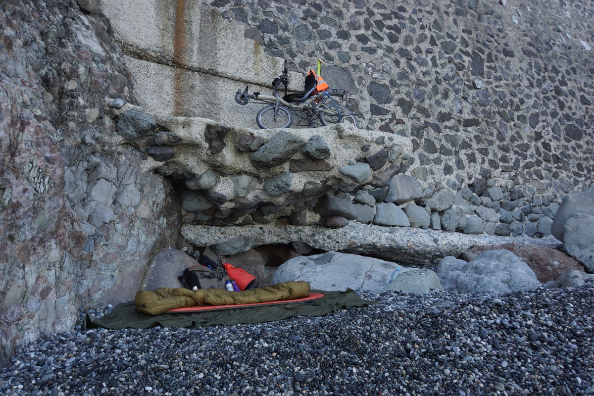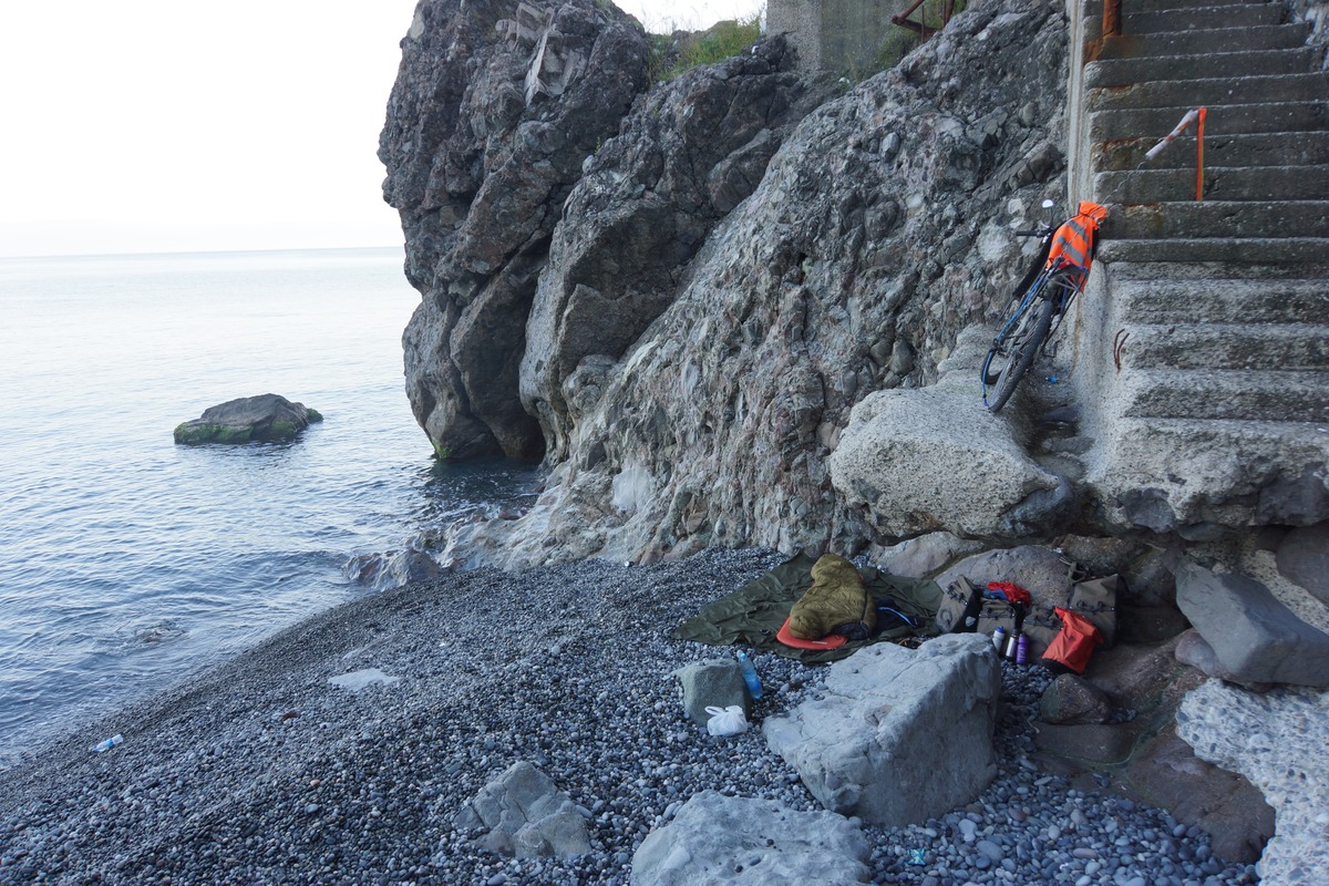Un bivouac d'accès difficile… Mais je voulais ou moins une fois coucher à la plage. De toute façon il n'y avait pas d'autre solution. A 500m de la frontière