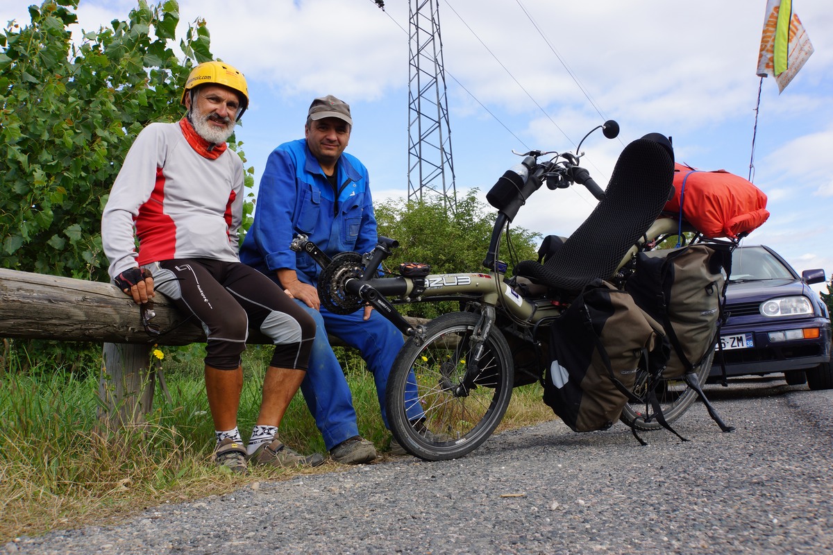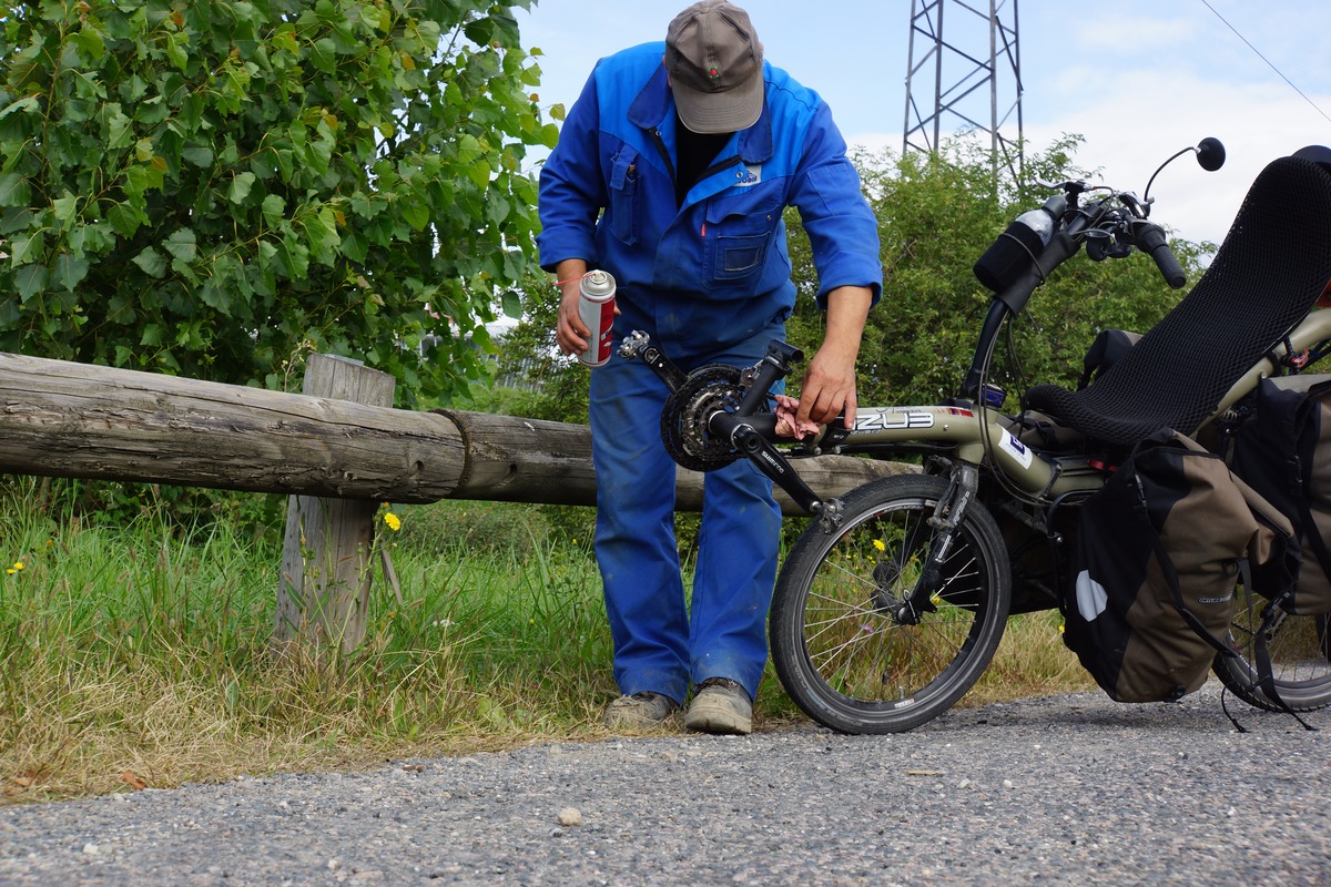 Je suis là dans ces pensées quand j'ai une envie pressante… Je gare le vélo et m'abrite derrière un bosquet. Quand je reviens, un employé de l'usine d'en face s'est approché de mon vélo, et à l'air bien intrigué. Je lui explique mon parcours, et il n'en revient pas. Et là, au fil de cet échange, je retrouve ces relations que j'ai connues dans d'autres lieux. Il me propose de m'inviter à boire quelque chose, mais contre mon gré je décline l'invitation, car le temps est compté. Il regarde, ou plutôt inspecte mon vélo, et trouve qu'il manque de graisse. Ni une ni deux, il part vers son atelier et revient avec une bombe de graisse. Et minutieusement, il s'occupe de la chaine et du dérailleur. Quelle attention ! Moi qui quelques instants auparavant regrettait ce genre de rencontre, voilà que ces événements prouvent le contraire, ici en France. Un de ses collègue le rejoint, et lui a déjà un voyage à vélo à son actif en Amérique du Sud. Il rêve tous les jours de repartir, et projette un voyage en Nouvelle-Zélande pour 2014. Ma présence attise dans ses yeux cette étincelle qui fait revivre ses souvenirs, et s'il le pouvait, il serait déjà reparti.