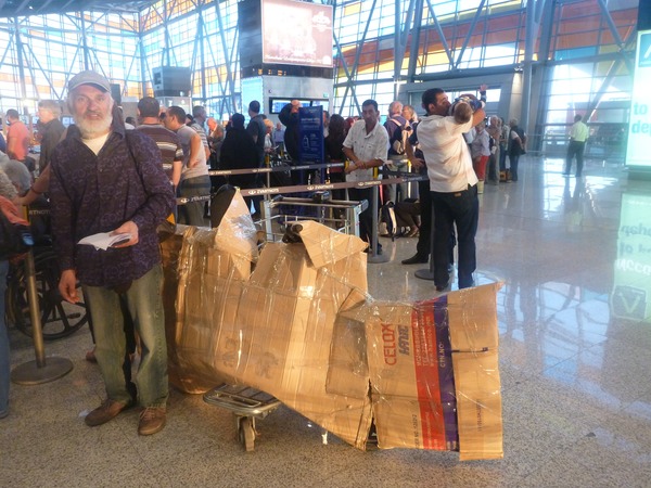 Après de longues discussions, la seule solution est de démonter le siège et refaire une partie de l'emballage. Je fais remonter l'autre sac déjà parti, où il y a les outils (mais finalement je n'en aurais pas besoin). L'avion risque d'être retardé en raison de ce problème, mais ce ne sera pas de ma faute, ils auraient pu s'assurer dès le début de la taille de l'emballage, ou le signaler à l'avance. Je démonte le siège et d'autres bricoles et refait l'emballage. Ouf, ça passe !