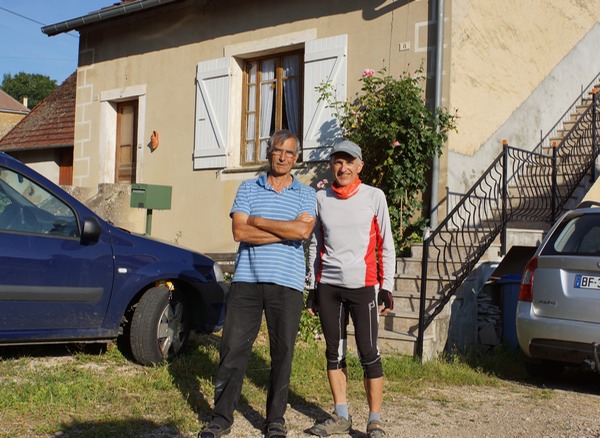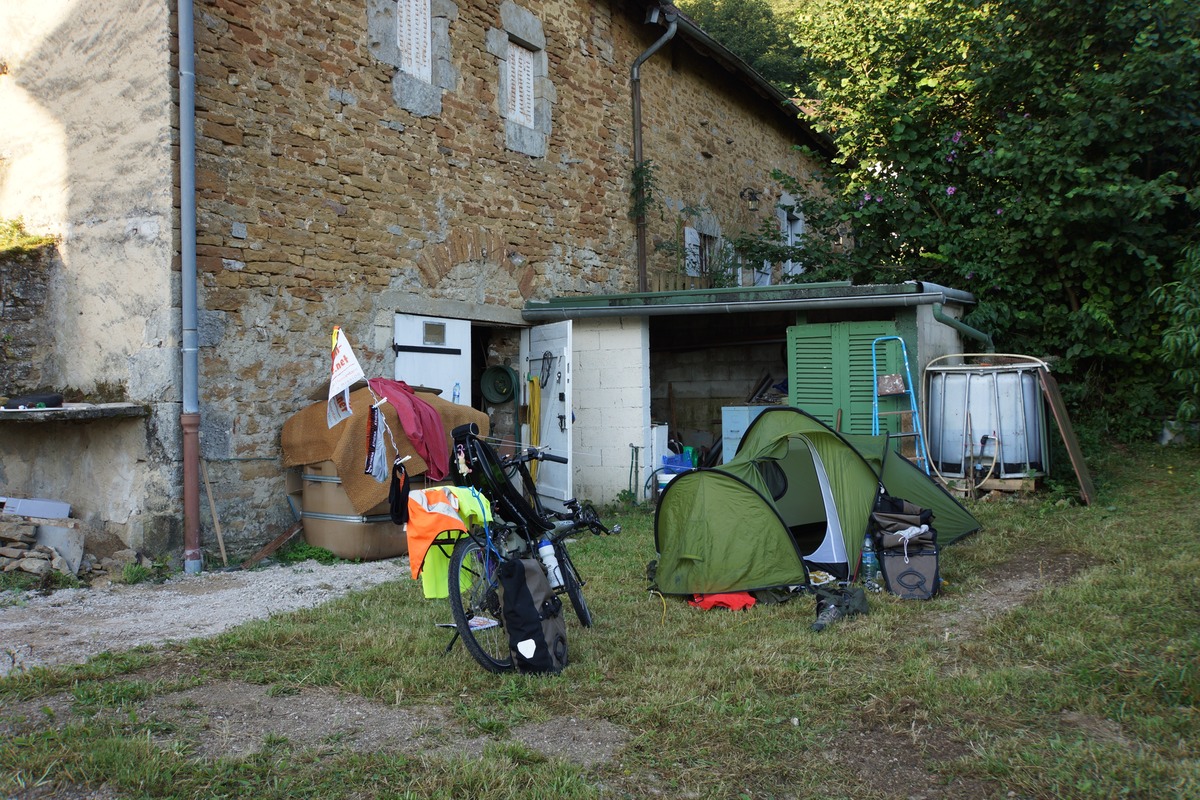 Après cet épisode qui a duré plusieurs heures, nous voilà enfin arrivés dans un petit village sympathique, ou je demande de l'eau à des personnes discutant devant leur maison. Et la dame me dit qu'elle m'a vu dans la montée en sortant de Lons-Le-Saunier, en se demandait ou j'allais comme ça. Je m'empresse de lui donner la réponse. "Et vous allez dormir ou ce soir ? - Je ne sais pas encore - Si vous voulez, nous avons un bout de terrain et vous pouvez vous installer…" J'étais justement en train de chercher un coin tranquille ! Formidable ! Première invitation spontanée.