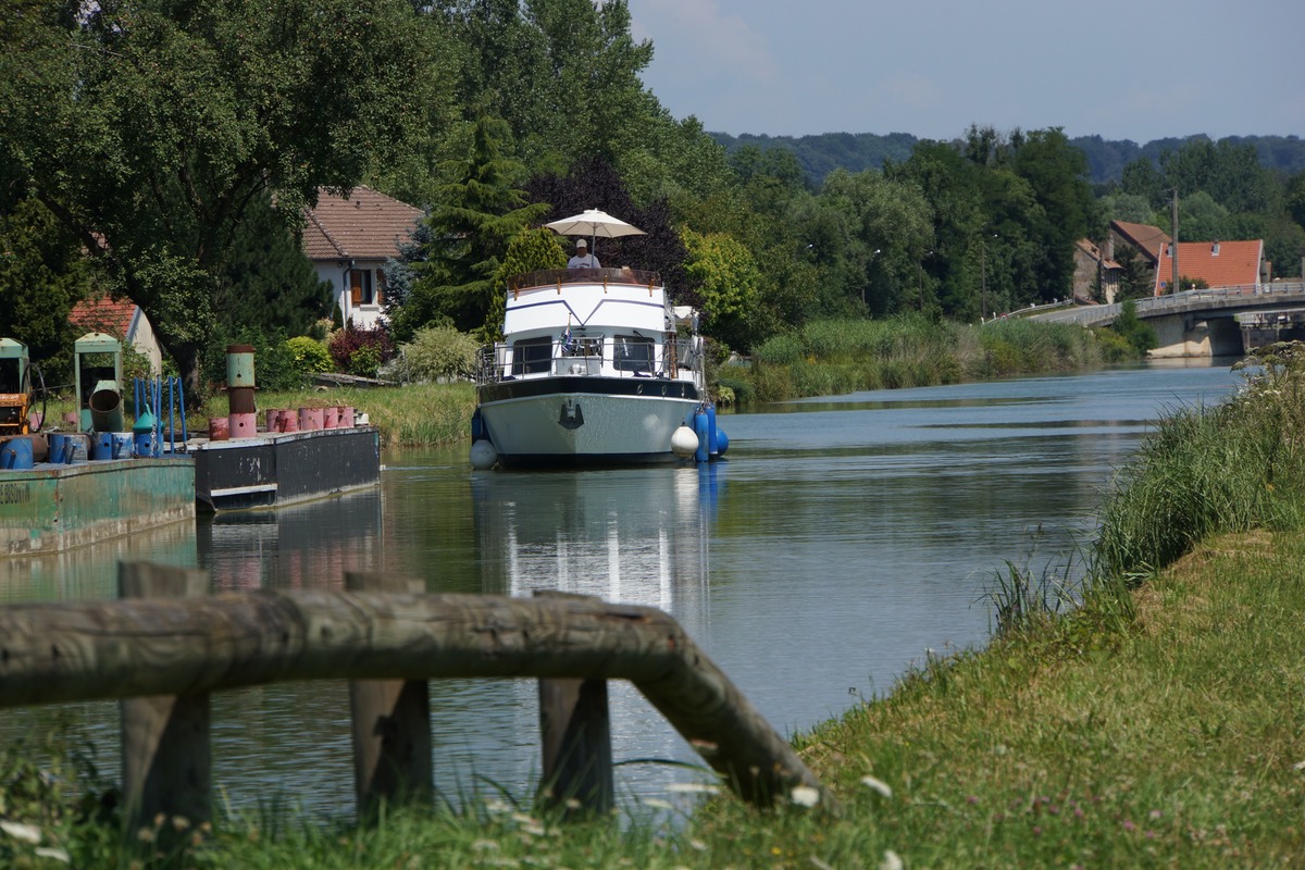 Avec un grand bonheur je rattrape enfin cette fameuse voie verte. Après l'enfer, c'est le paradis. Une petite voie uniquement réservée aux vélos et piétons, le long des canaux ou du Doubs. On y roulerai des kilomètres. Vers 13h je ne vois pas grand monde. Je pense que c'est le repas, mais je réalise qu'il fait une chaleur terrible (peut-être 35° ?) et que ce doit être pour cette raison. Pour moi pas de problème, cela ne me dérange pas, je continue.