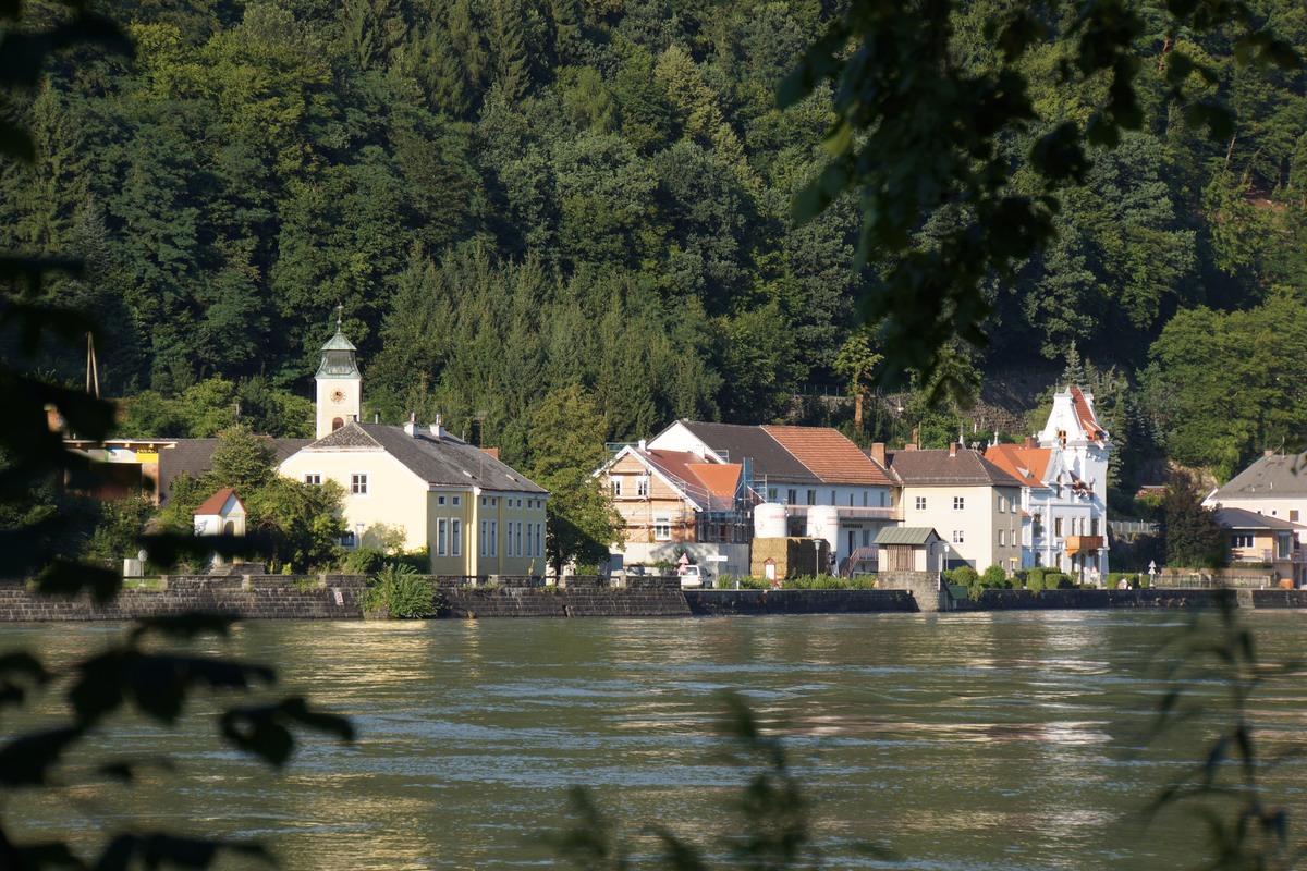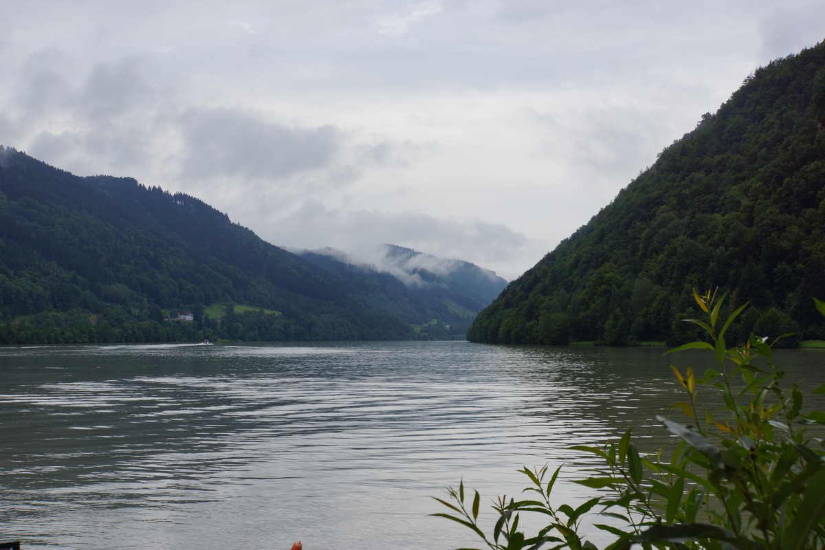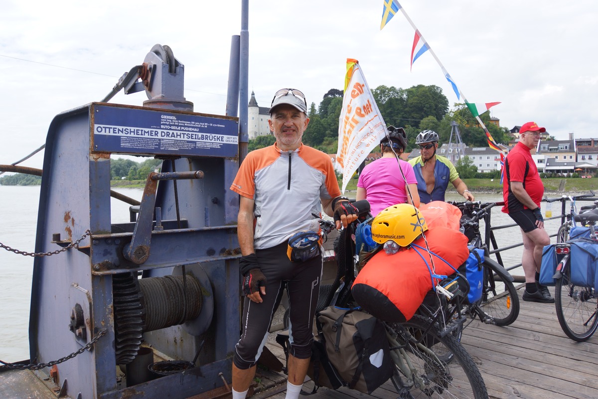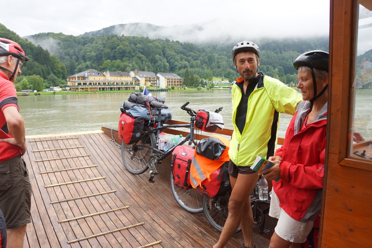 La route longe le Danube. Je crois que c'est une des plus magnifiques portions que j'ai faite le long de ce fleuve, malgré la pluie fine qui tombe. Nous longeons de magnifiques forêts, de beaux chalets, et le tout respire la paix, loin du stress et de l'agitation. Une oasis. Un peu plus loin, arrêt obligatoire. Il faut prendre un petit bateau uniquement réservé aux piétons et vélos, car la route s'arrête. Mes amis français me rejoignent dans l'attente du départ. La traversée dure 10 mn, mais c'est très plaisant.