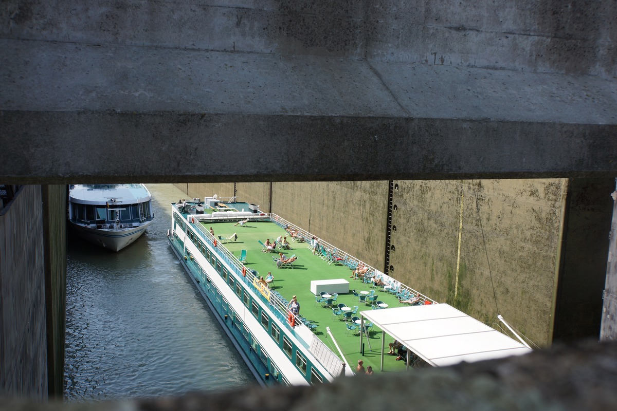 Ce grand fleuve est parsemé d'énormes écluses par moment, ou les bateaux de croisière y passent à plusieurs.