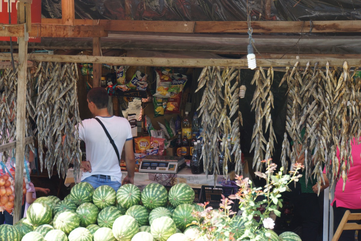 Je décide de quitter cette route, vraiment trop fréquentée, pour passer par la plus petite route longeant la cote, puisqu'il y en a une maintenant jusqu'à Yalta. Elle passe par tous les petits villages ou les hordes de touristes en vacances se baladent bardés de bouées, serviettes, etc. On se croirait à Palavas-les-flots. Vous voyez le style. Mais ça ne va pas durer longtemps. Une nouvelle averse plus forte que les autres démarre. Et ça devient le déluge. J'en profite pour m'abriter devant un magasin. Un jeune vendeur du stand primeur en face vient discuter, et prend la photo. Je vais le voir ensuite pour acheter quelques fruits, mais refuse le paiment !