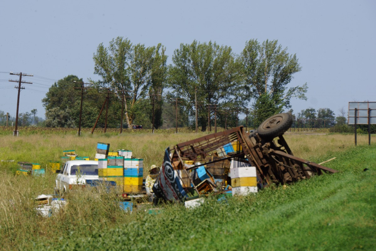 Remorque renversée au bord de la route avec au moins 200 ruches...