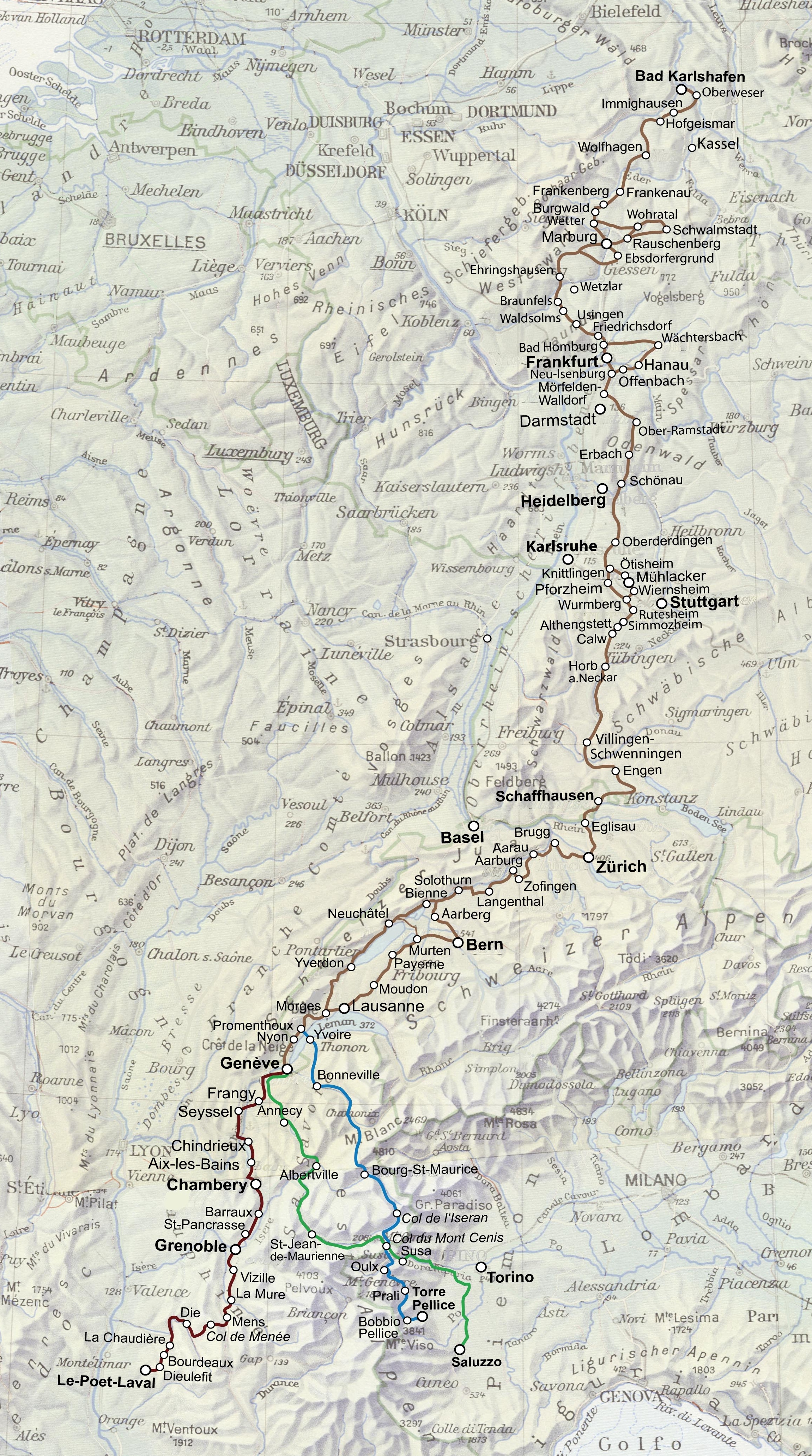 Cette aventure a suivi le sentier « Sur les pas des Huguenots ». Le parcours initial démarre à Poët Laval dans la Drôme, passe par Genève, et se termine à Bad Karlshafen, dans la Hesse. Il a été agréé « GR965 » par la Fédération Française de Randonnée pour la partie française, ainsi que labellisé « Itinéraire Culturel du Conseil de l’Europe ». Il retrace, grâce aux éléments historiques, le chemin emprunté par les protestants après la révocation de l’Édit de Nantes en 1685. La branche cévenole part de Mialet (du Musée du Désert), pour rejoindre le sentier principal à Die. Par dizaines de milliers, contraints à l’exil, les Huguenots ont fui la région des Cévennes et du Dauphiné pour rejoindre les pays du refuge : Suisse, Allemagne, Pays-Bas, voire plus loin. Aujourd’hui encore il est possible de retrouver leurs descendants dans certains villages.