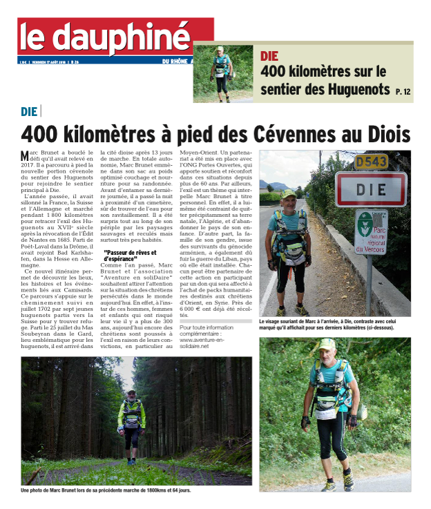 Comme pour l’année passée, ma démarche solidaire, avec l’association « Aventure en soliDaire », était d’attirer l’attention sur la situation des réfugiés en Syrie. En effet, à l’instar de ces huguenots qui ont risqué leur vie il y a plus de 300 ans pour vivre librement de leur foi, aujourd’hui encore des chrétiens sont poussés à l’exil en raison de leurs convictions, en particulier au Moyen-Orient. Un partenariat a été mis en place avec l’ONG Portes Ouvertes pour les soutenir. (Il est encore possible de faire un don pour acheter des packs humanitaires pour la Syrie).