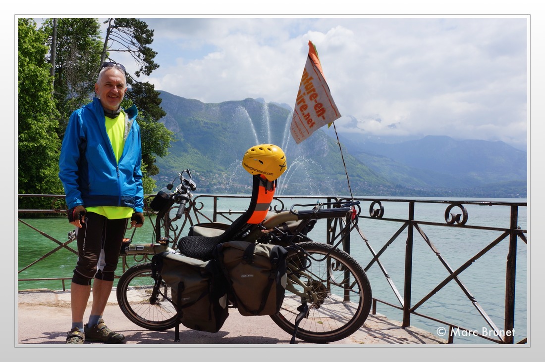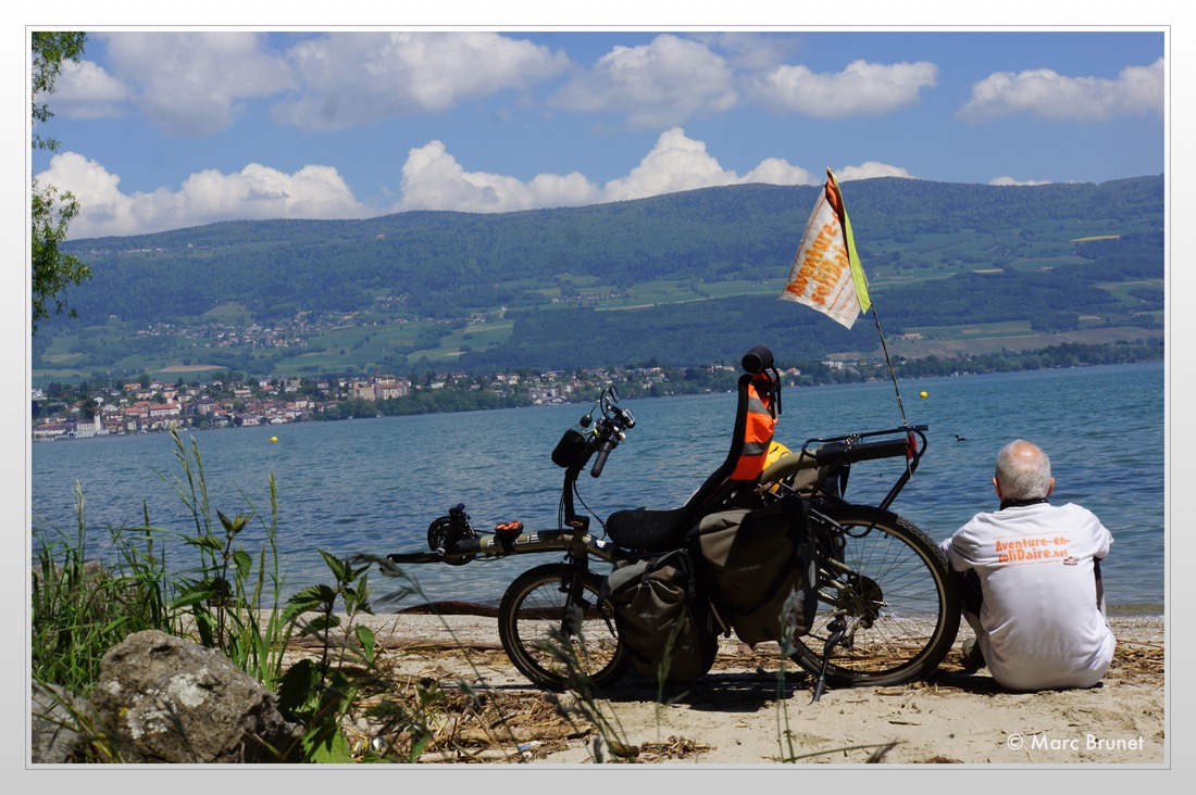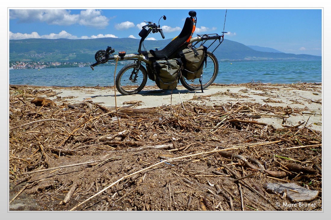 Dans l'après-midi j'appelle mon ami Eddie qui doit venir me rejoindre sur la route. Quelques kilomètres plus loin nous nous rejoignons près du lac du Bourget. Alors on évoque tous nos vieux souvenirs, datant maintenant de quelques années (pratiquement 15 ans), et notre dernière folle virée en VTT en Savoie. On était jeunes… Nous croisons par hasard un de ses amis en vélo couché.