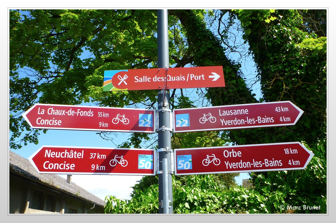 Petit parcours pour rejoindre Neuchâtel le long de la piste cyclable. La Suisse est un pays intéressant pour les voyageurs à deux roues. Il y a de nombreuses voies cyclables et bien signalisées en général.