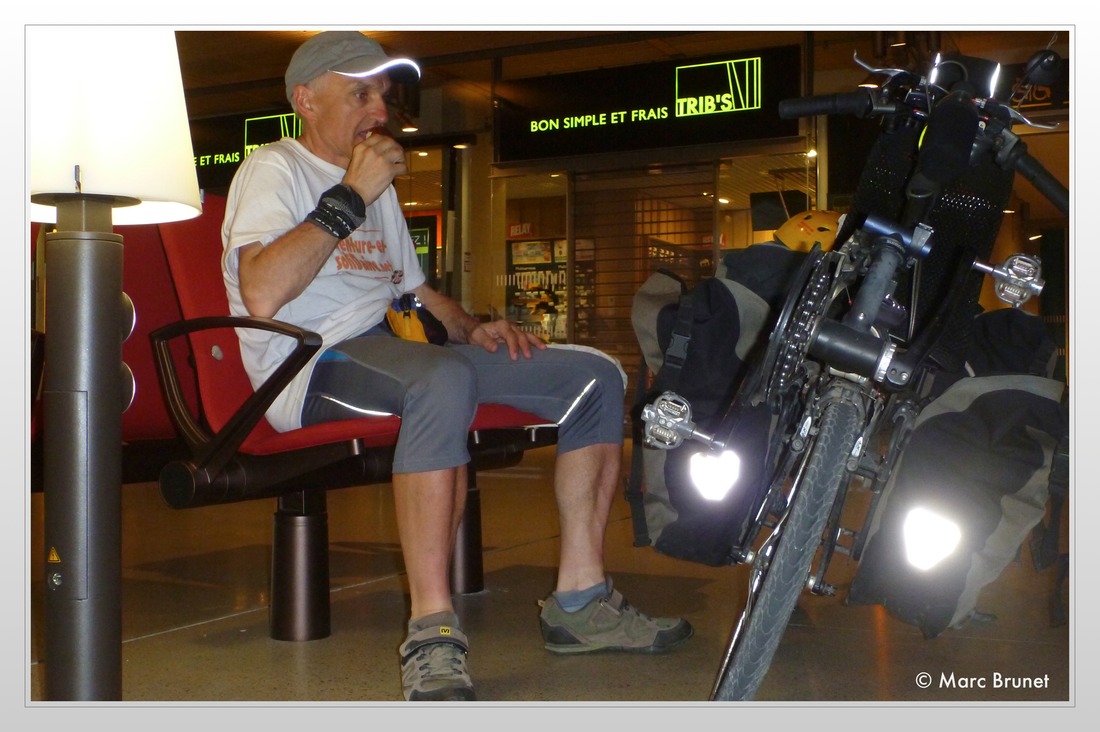 Dans cette gare déserte, un homme s'approche, fan de vélo, et nous échangeons quelques mots. Je lui laisse un document sur mes aventures. Le lendemain, je reçois un email de sa part. Il a consulté le site et il se trouve que nous avons des relations communes, des amis musiciens avec qui j'ai joué dans mon jeune âge. Ces rencontres improbables m'étonneront toujours… qui ne tiennent qu'à l'endroit où je me suis senti poussé à m'asseoir.
