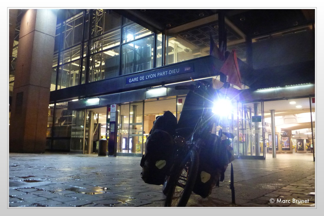 Le TGV est à l'heure. J'arrive à Lyon Part-Dieu quelques heures plus tard. Il est 23h30 et je n'avais pas vraiment envisagé de suite, c'est à dire un endroit pour dormir. Alors comme je me sens en forme, je me décide à m'installer sur mon vélo-couché. De toute façon, j'ai mon sac de couchage au cas où. Et ce sera finalement une balade sur la ViaRhôna toute la nuit jusqu'à l'arrivée chez moi à 8h15. Quelle expérience ! Je n'avais encore jamais vécu ce genre d'aventure. Après une traversée de Lyon by night, je trouve la voie qui mène à la ViaRhôna. Je croise quelques personnes dans un état assez joyeux qui m'interpellent "Et toi, qu'est-ce que tu fais là ?" Effectivement, on peut légitimement se poser la question à plus d'une heure du matin, même sans être complètement imbibé…