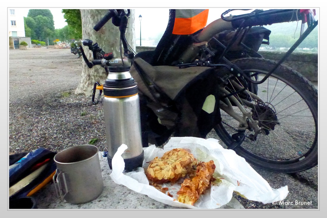 Le plaisir que j'attendais, c'est déguster quelques viennoiseries assis au bord du Rhône, dans la fraicheur et la solitude du matin. Ce sera chose faite à Tain l'Ermitage, au pied des vignobles réputés, juste avant mon retour au bercail.