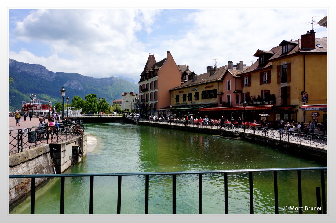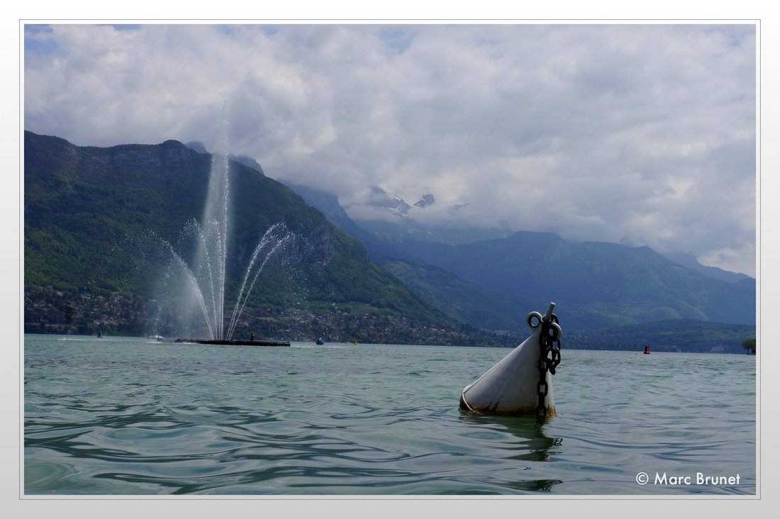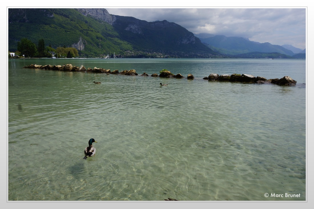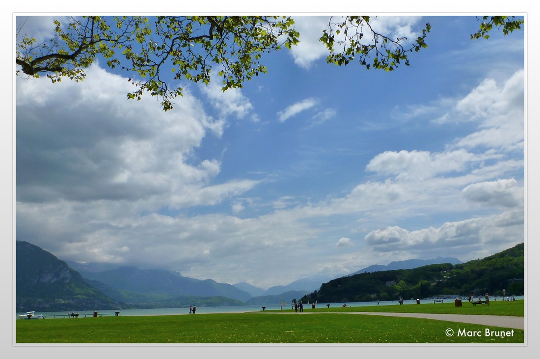 Aujourd'hui j'avais envisagé un rendez-vous, mais je n'avais pas eu de confirmation. Après un coup de fil avant le départ, le rendez-vous est pris, et je dois donc filer sur Annecy. Comme je ne peux finalement pas arriver avant midi, je flâne et je mange au bord du lac. Endroit féérique, comme si les montagnes formaient un écrin pour protéger les eaux translucides de cette étendue. On resterait là des heures. Petits échanges avec des motards présents sur les lieux. Surprise ! Ils viennent de la région où je dois aller en Août pour une conférence, et connaissent le festival. Ils m'assurent qu'ils seront présents…