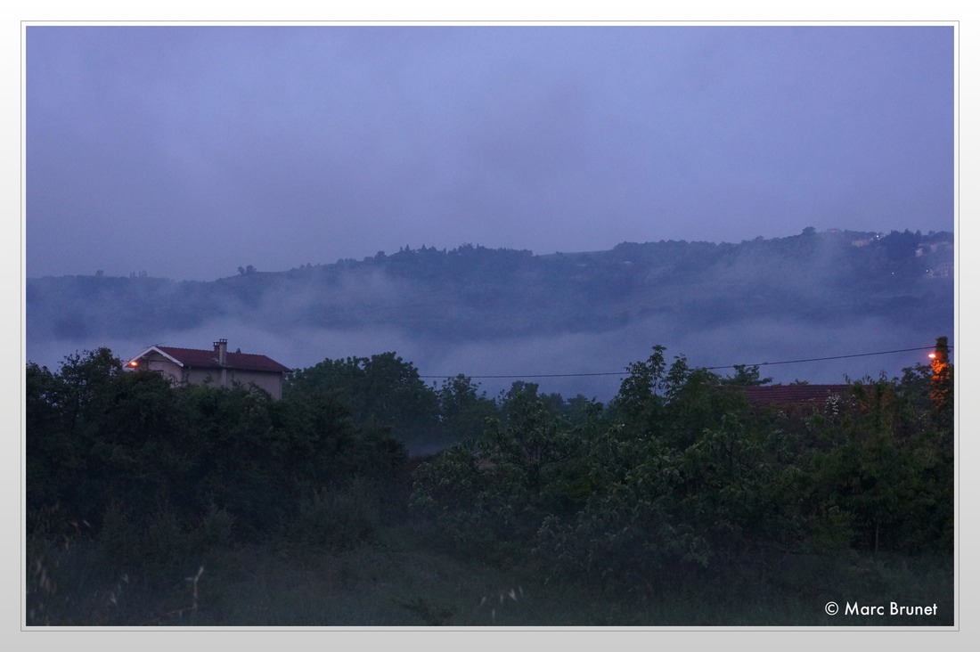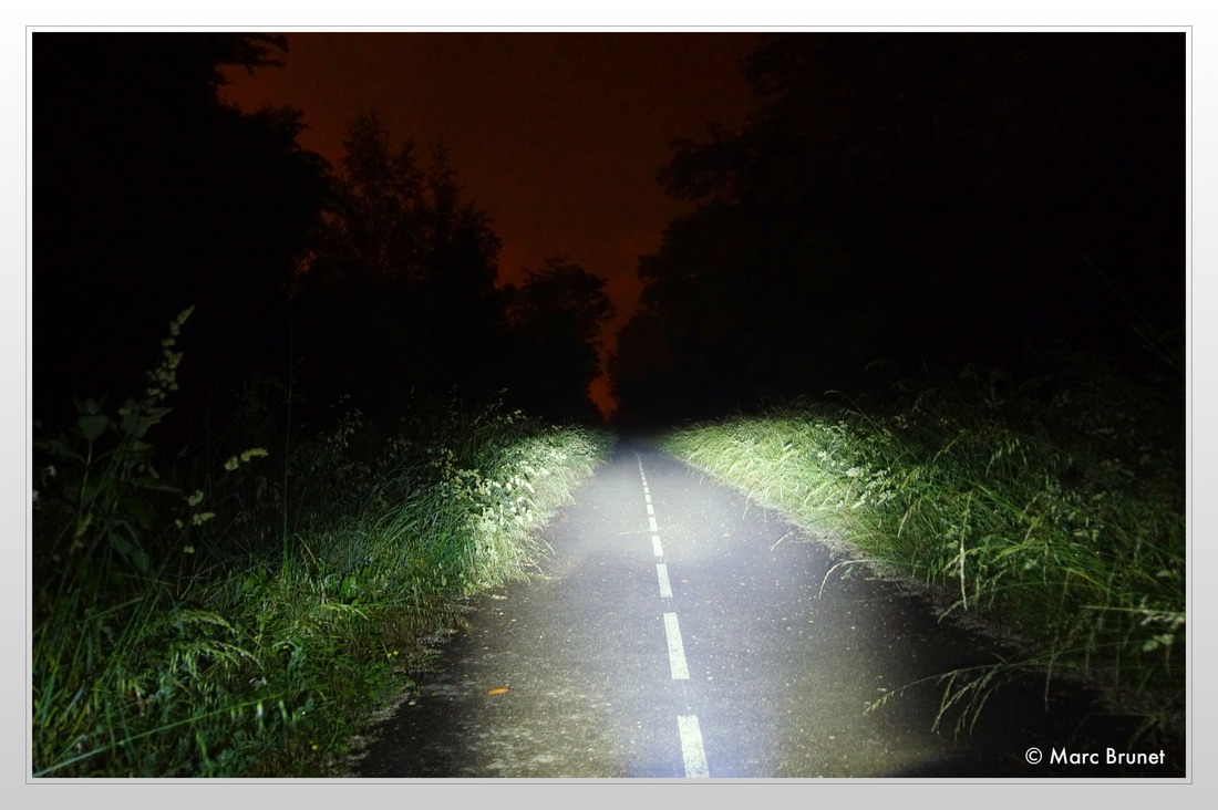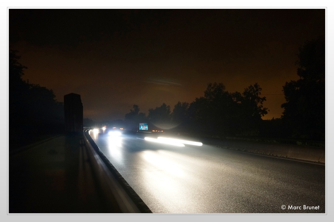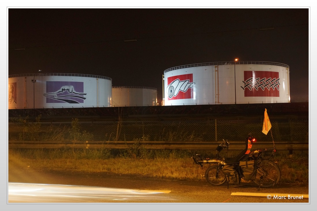 Les heures défilent et la route aussi. Heureusement que je commence à connaitre l'itinéraire de la ViaRhona. Sans quoi je me serais égaré plusieurs fois dans ce parcours de nuit. Une ambiance particulière que de rouler dans la nuit, avec en toile de fond les lumières surnaturelles des villages, maisons, usines, créant parfois des paysages surprenants et imaginaires. Est-ce la fatigue ou l'imagination ? Quelquefois on croit voir un incendie, ou un feu d'artifice, d'autres fois on se croirait plongé dans l'ambiance d'un film. Tout est différent. Vers 4h00, je m'allonge quelques minutes à même le goudron. Je sens l'humidité. Et là tout un tas de souvenirs remontent, de ce que j'ai vécu lors de la Diagonale des Fous à la Réunion. Je me revois à courir durant ces nuits sans fin, où chaque pas était une victoire pour atteindre la ligne finale. Ambiance démentielle, course hors normes. Quand je me relève au bout de cinq minutes, je me sens exactement dans l'état où j'étais après ma première heure de sommeil à La Réunion, au bout de 2 jours de course, mais en moins pire : l'impression de revenir dans le monde réel, après quelques secondes pour réaliser où je suis. Je n'aurai l'occasion de bailler qu'une seule fois vers 5h00, au moment où le jour commence timidement à poindre, dans le concert des oiseaux qui nous invitent à nous réjouir de cette nouvelle journée. Aucun cycliste croisé le long des ces 130 kms ! Bizarre… Par contre, j'ai dû ralentir à plusieurs reprises pour éviter nombre de crapauds et d'escargots traversant la voie. Ils ont envie de se suicider ou quoi ? Pas de "passage piéton" prévu pour eux sur la ViaRhôna. On va faire une pétition.