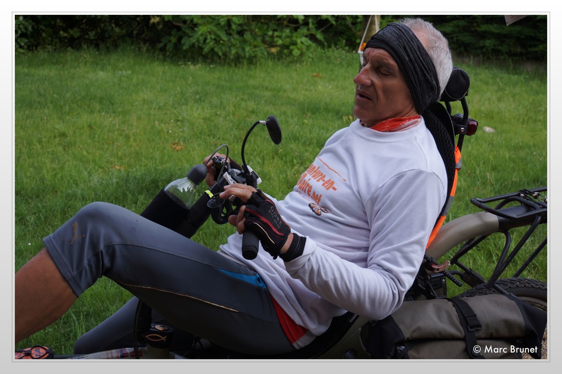 Mais alors que j'avais avancé à peine de 5-6 kms, mes pensées sont brusquement arrêtées. Rien de grave. Je croise simplement 3 cyclistes, dont un à vélo couché, qui, je le découvre, n'habitent pas très loin de chez moi. Petits échanges sur nos pratiques et sur le vélo couché. Et puis une réflexion tombe : " Ta femme te laisse partir comme ça ? La mienne a râlé ce matin parce que je faisais une petite sortie…" Désolé l'ami, de ce côté-là, pas de soucis. Elle me soutient à fond, il faut juste s'y prendre à l'avance et négocier les absences…