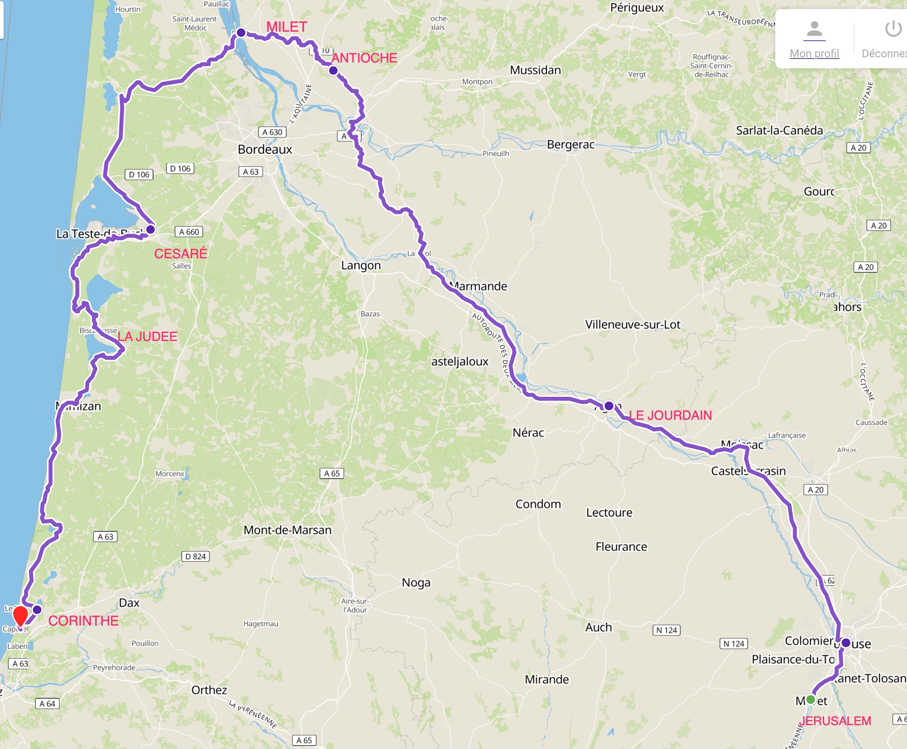 La deuxième phase s’est déroulée de Jérusalem (près de Toulouse) à Corinthe (dans la région de Bayonne), en passant par le Jourdain (Agen), Antioche, Milet (Bordeaux), la Judée (Biscarosse) et Césarée. La dernière a eu lieu de d’Emmaüs (Nantes) à Cana (Dinan), en passant par Gaza (Angers) et Sion (Laval), en octobre 2020.